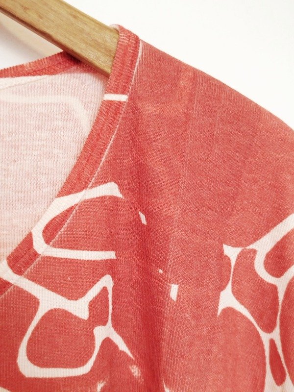 Modelo amplio y recto, escote en V, tajos laterales y manga corta.
